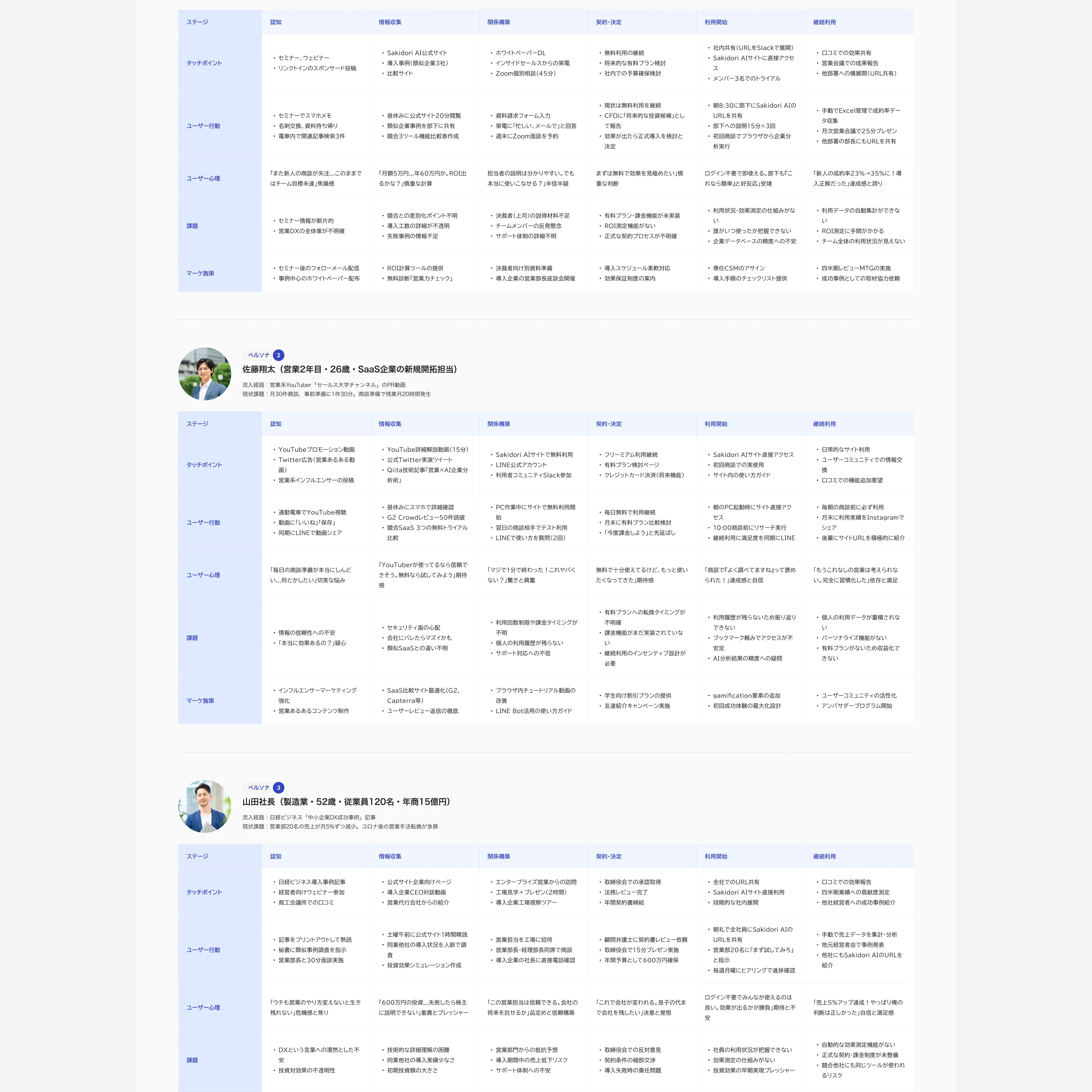 PoC(概念実証)フェーズからご相談いただき、まずはターゲットユーザーの整理やカスタマージャーニーの策定から着手しました。「先取り」というサービス名から、先を見通す信頼感と親しみやすさの両立を意識してブランディングを設計。ロゴはAIの知性を感じさせつつ、営業現場で日常的に使われるツールとしての馴染みやすさを重視しました。