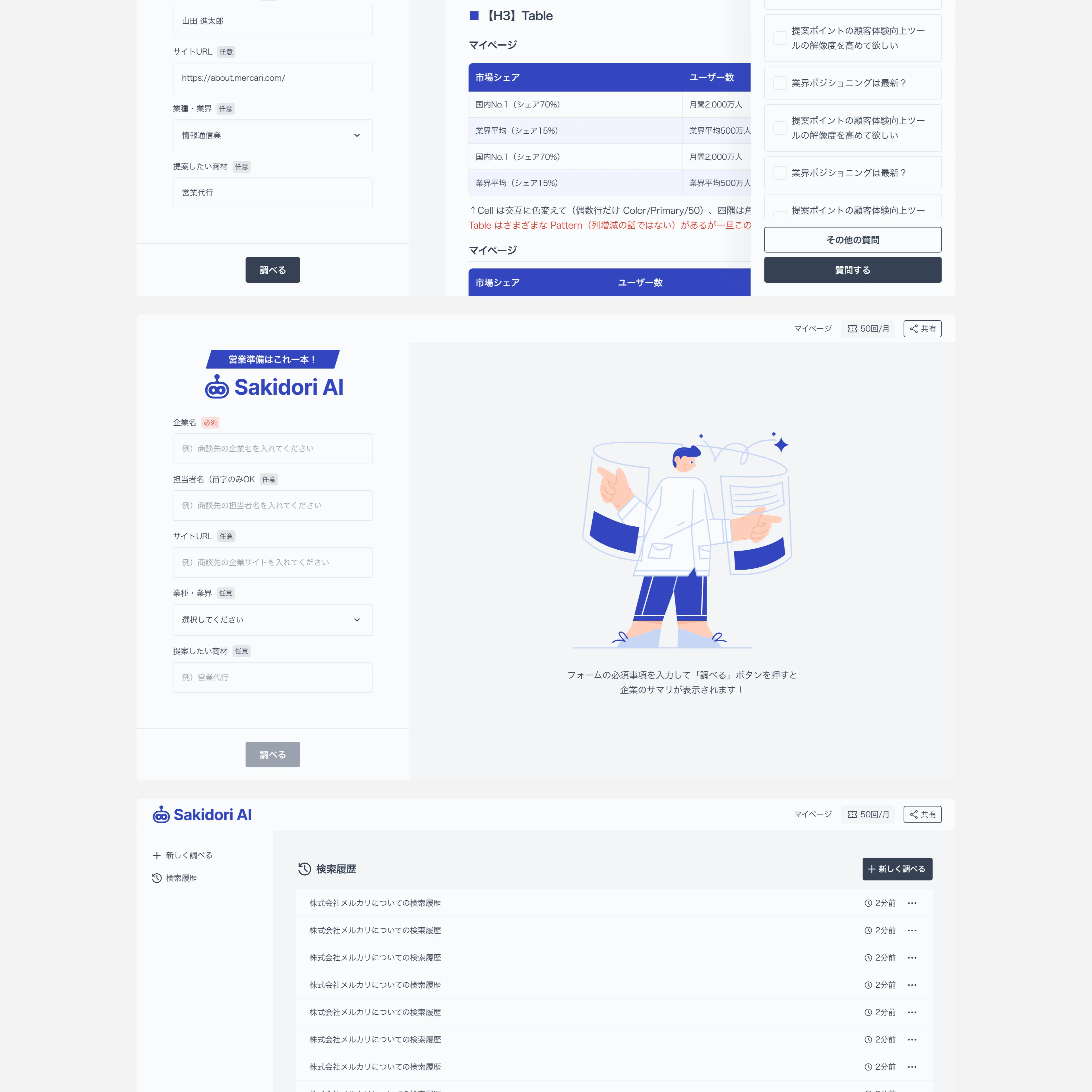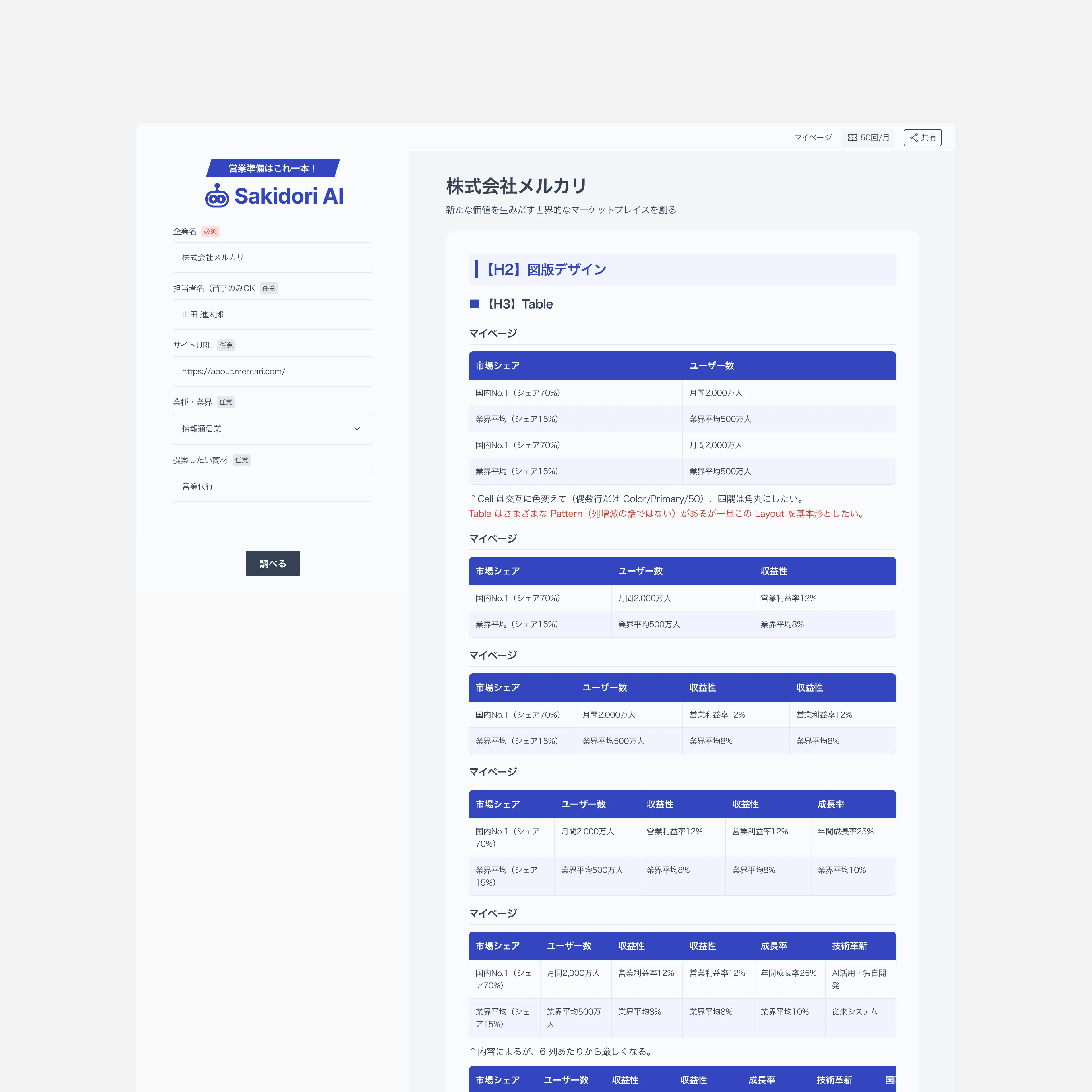 「現状の人員で売上を伸ばしたいが、商談準備に時間を取られすぎている」多くの営業組織が抱えるこの課題に対し、Sakidori AIは企業名を入力するだけで市場シェア・成長率・競合ポジションなどを自動で収集・整理。準備時間を大幅に短縮し、同じ人数でより多くの商談と質の高い提案を可能にするプロダクトです。